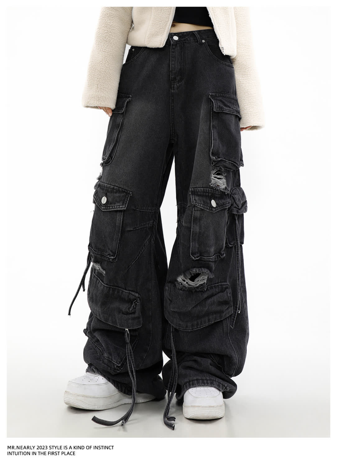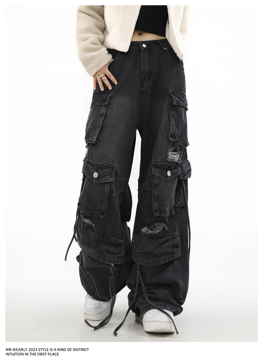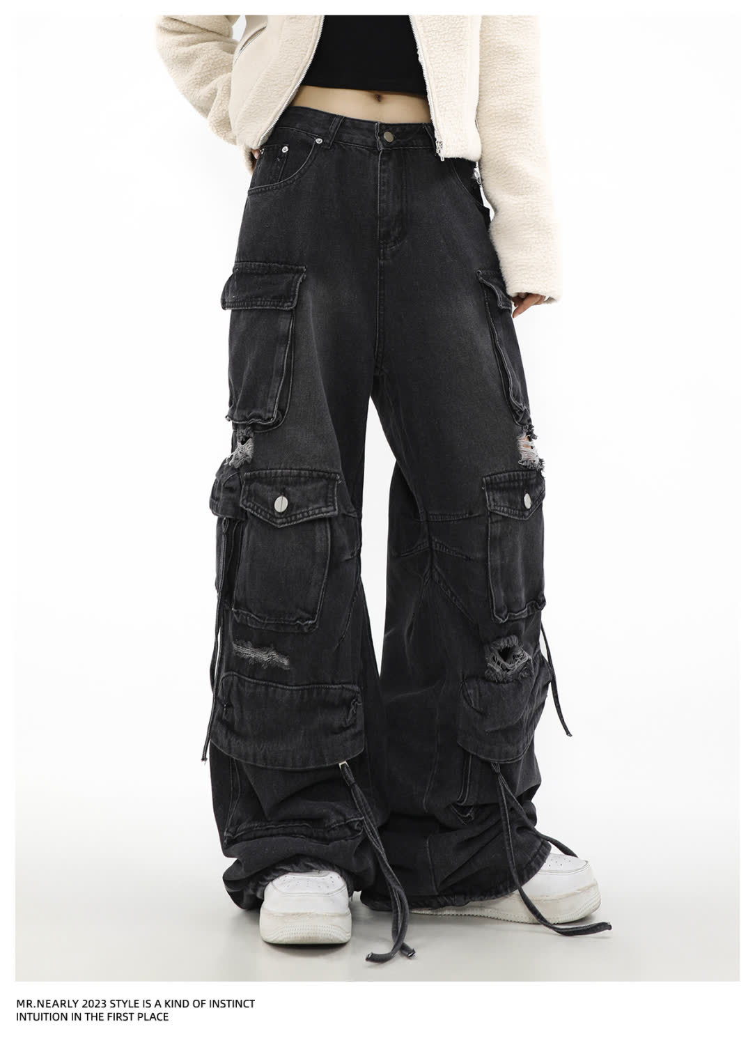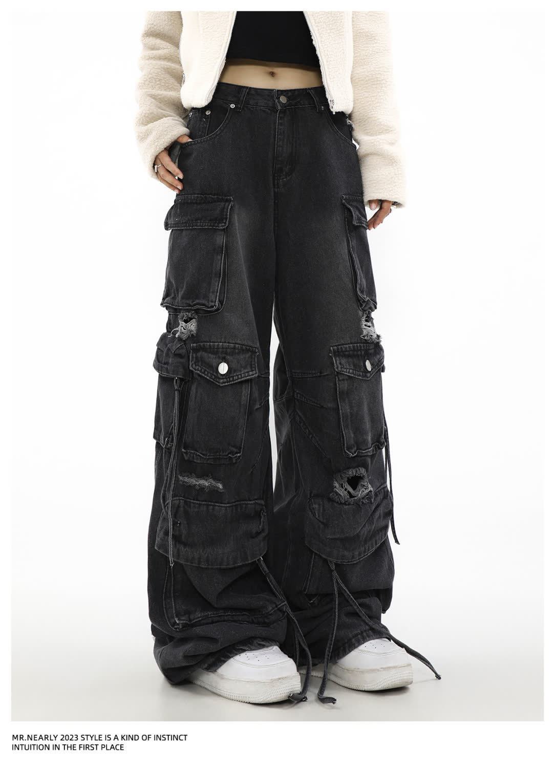Women's Loose Straight Ripped Jeans with Multiple Pockets