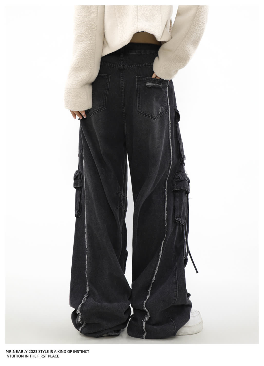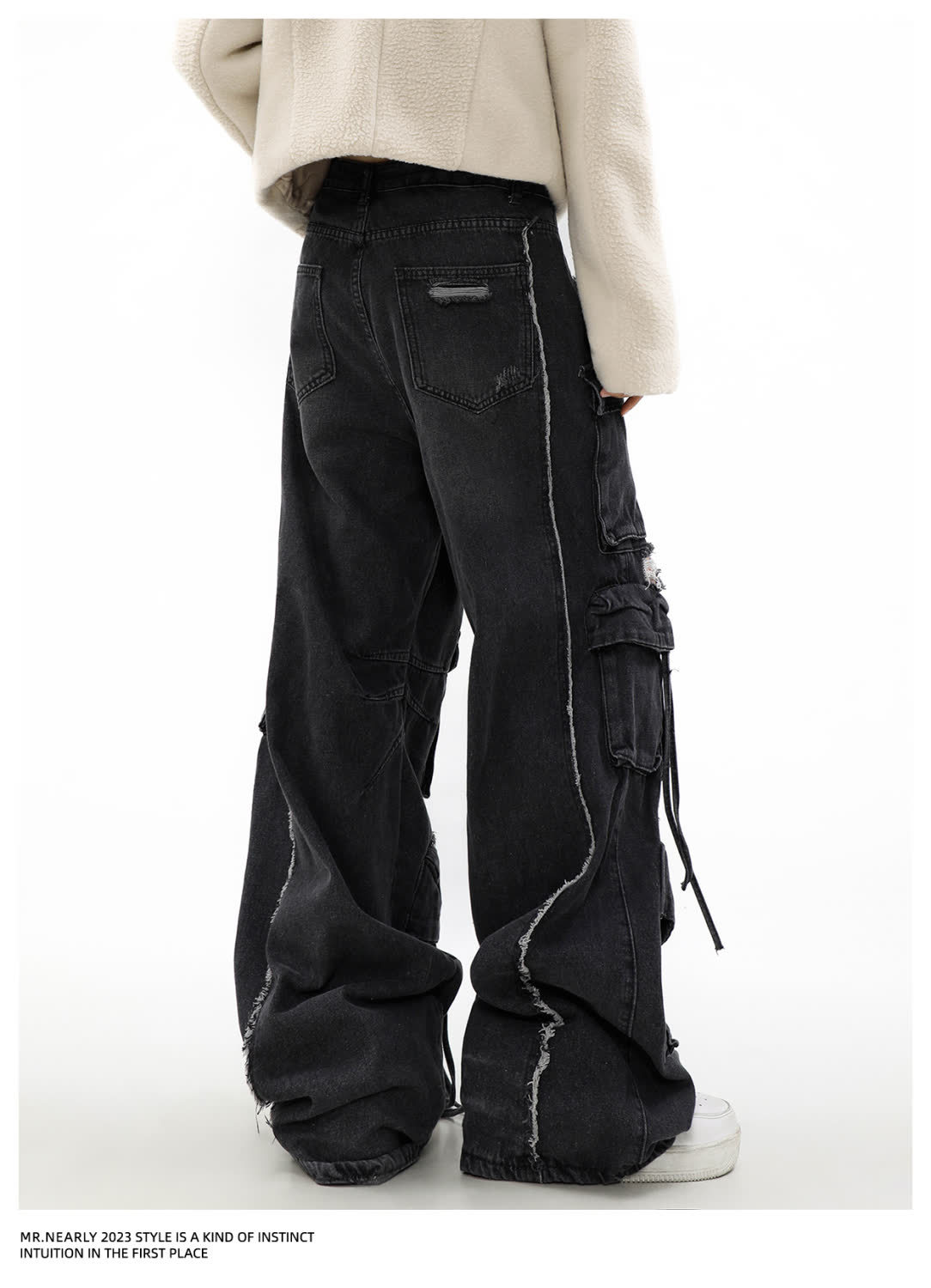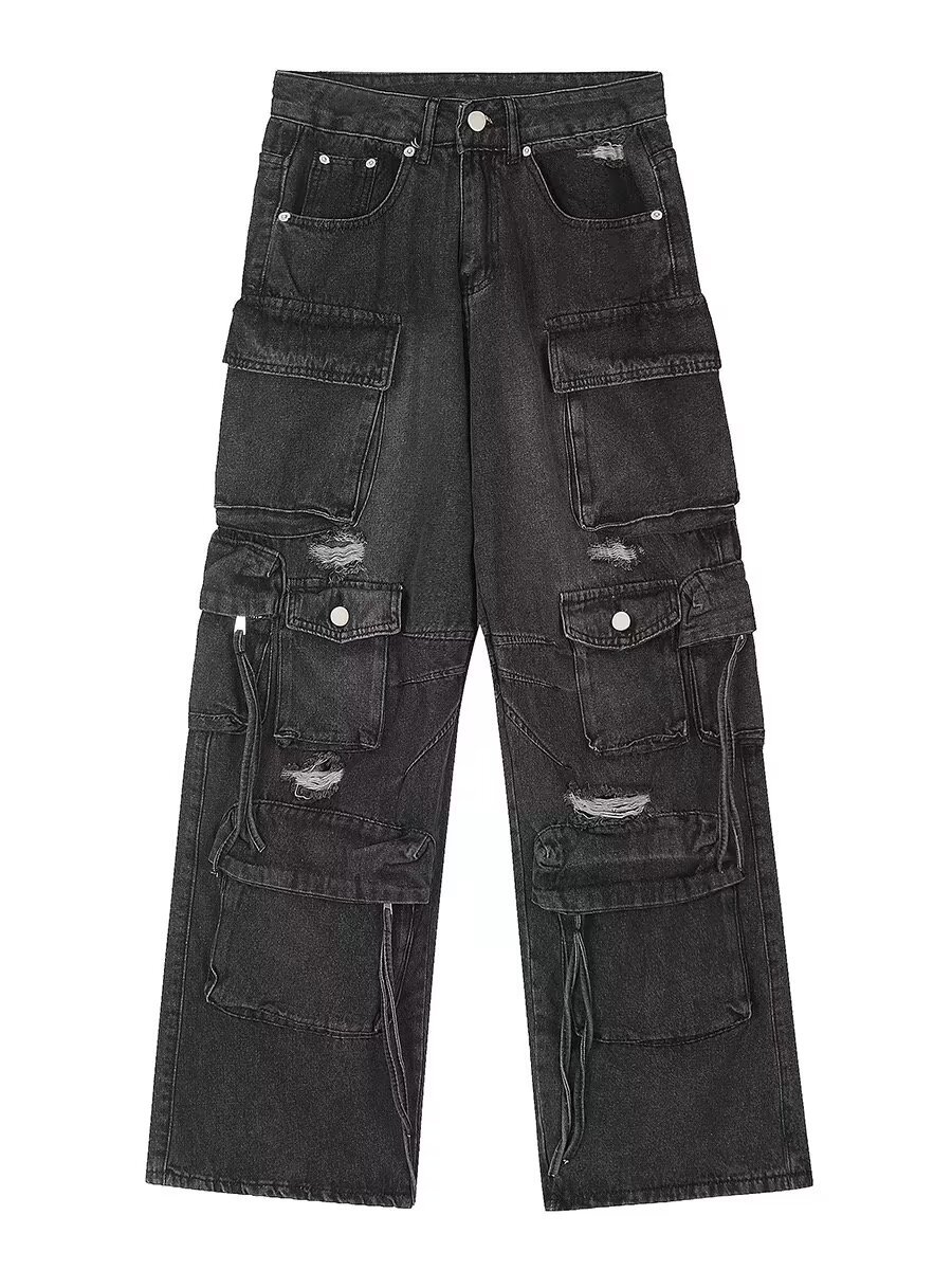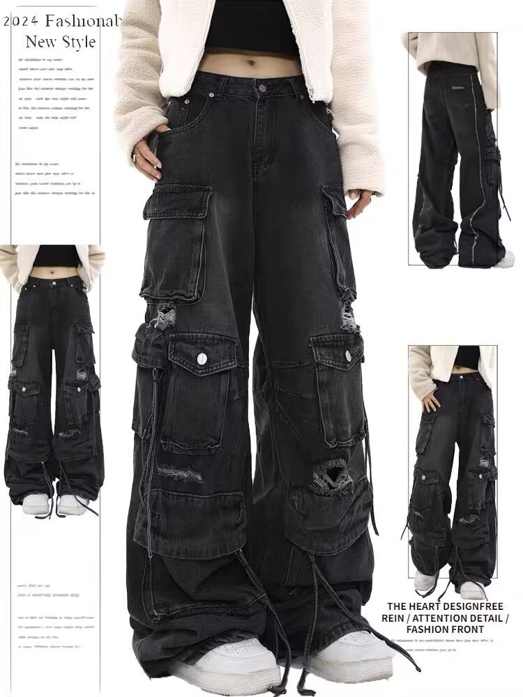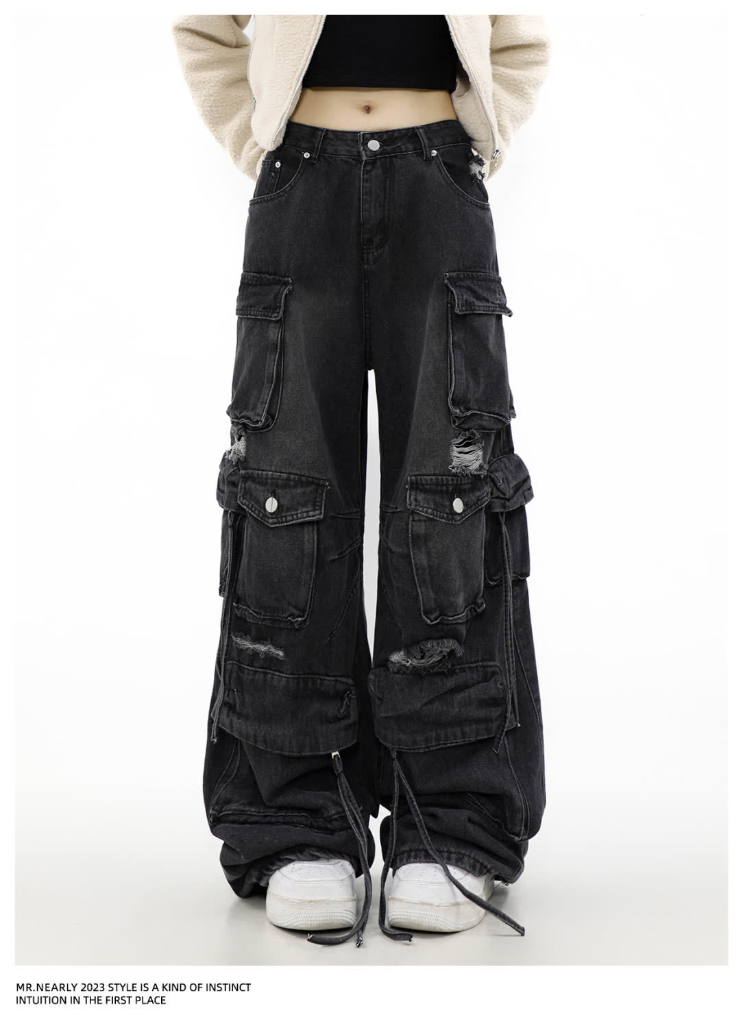 Women's Loose Straight Ripped Jeans with Multiple Pockets