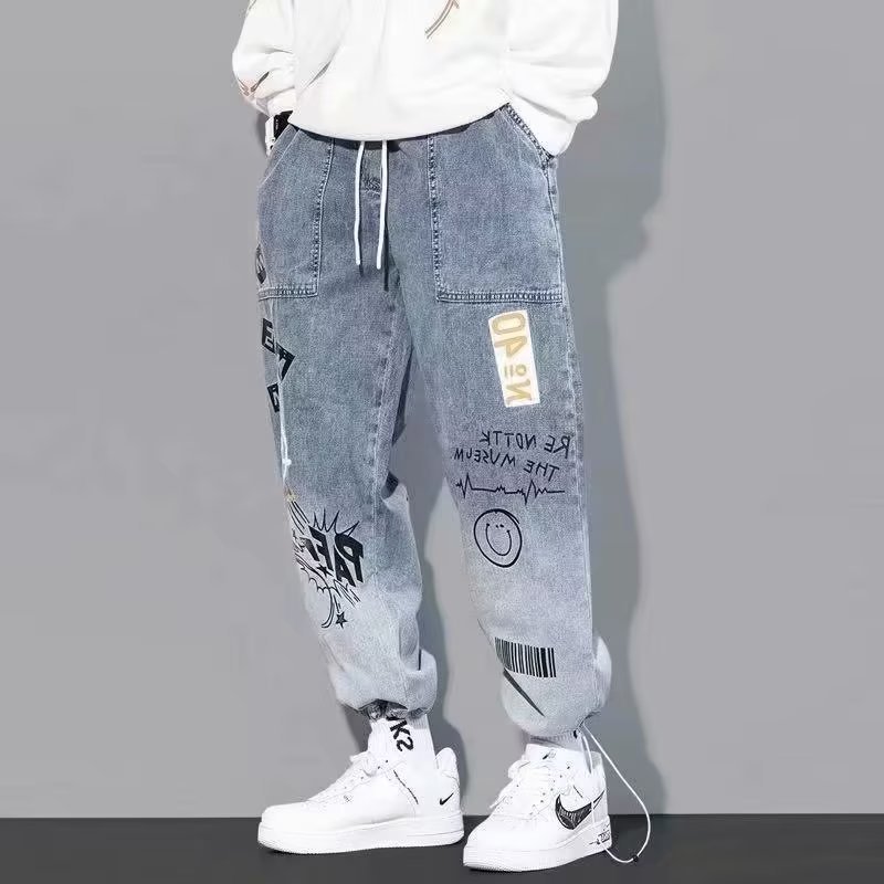 Letter Print Design: Stylish jeans with trendy letter print for a modern look.