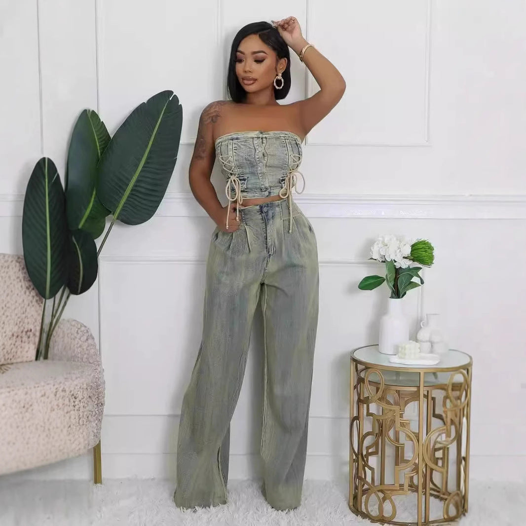 Strapless Vest & Straight Leg Pants Set: A stylish 2-piece set combining a trendy strapless vest with distressed
